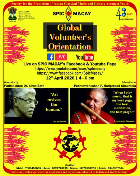 SPIC MACAY invites you to attend first ever Global Volunteer's Orientation on 12th April 2020 from 4-6pm. We had wonderful orientation sessions by Padma Vibhushan Pandit Hariprasad Chaurasia, Padmashree Dr. Kiran Seth with volunteers followed by interactive Q&A session.